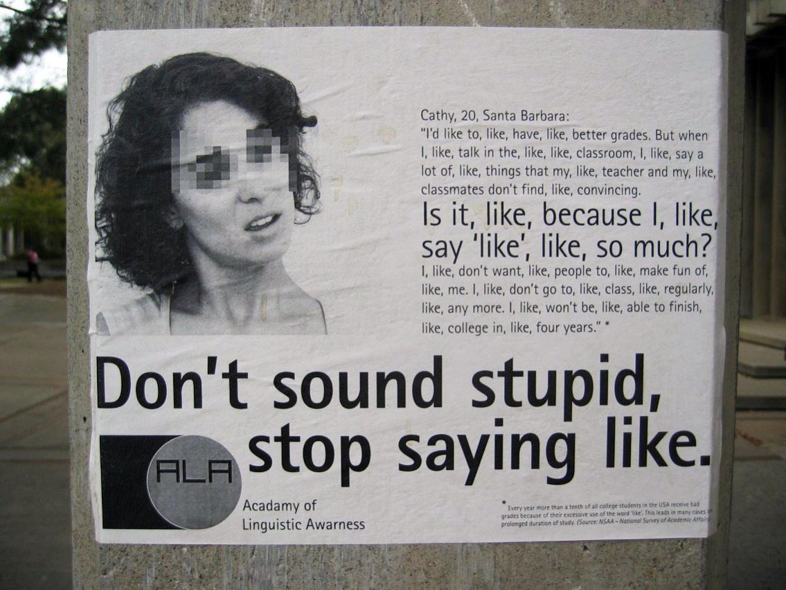 Today I had to work in an un-air-conditioned high rise on a day when the temperature rose into the 90s. Midway through, I took a break and walked over to the UCLA campus, where I had lunch and hung out in the student bookstore for a while. Along the way (it was one mile in each direction), I heard snippets of a lot of conversations. You’ll never guess what the most frequently used work was. It was, like, like.