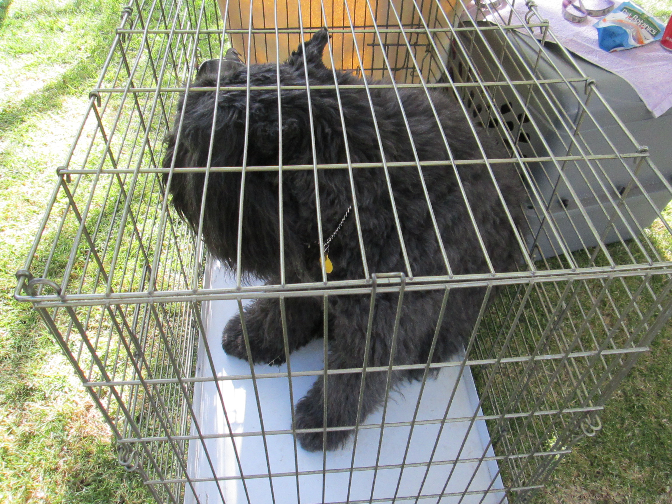 Yesterday, Martine and I went to a large Irish Fair held at El Dorado Park in Long Beach. Thanks to an extremely fine perception of space, I was missed by a fraction of an inch by a charging sheep during the sheepherder dog demonstration.There I was, standing on the sidelines between two tents when, suddenly, someone let the Bouvier des Flandres out of his cage (above), and he charged the sheep, sending them scattering at top speed in all directions. Although the Bouvier was at the show, he was not yet trained to herd sheep without representing a threat to them. The upshot was, I saw my life pass in front of my eyes while being charged by one of the sheep. Before I knew it, all of them had disappeared behind a line of port-a-potties.