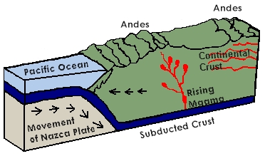 Below is an illustration of how the Nazca Plate (in light brown) subducts the South America Plate (in green), thereby causing all these dire events (and, by the way, over the millennia, causing much of the beauty of the Andes as well):