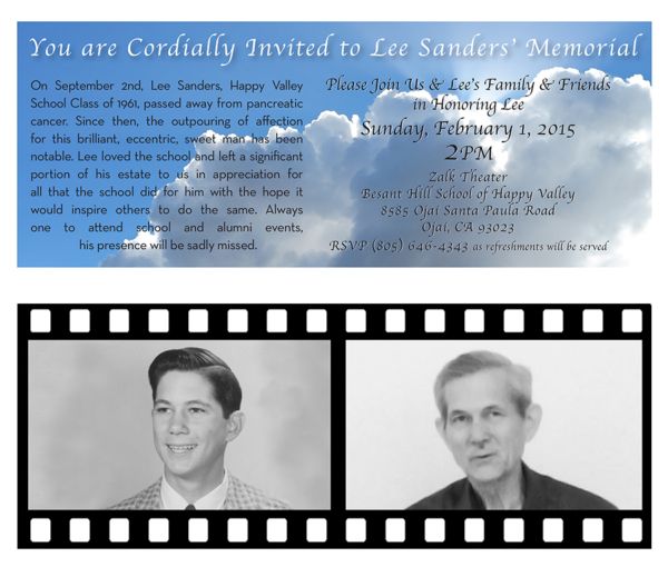 Instead of watching professional wife- and girlfriend-abusers concuss each other today, I did something that was a thousand times more satisfying: I attended a memorial service for my late friend Lee Sanders at the Besant Hill School of Happy Valley in Ojai, of which he was an active alumnus. Gathered there were members of his family, old friends (of whom I am one), and his former associates in the IATSE Projectionists Union Local 33 and the Culver City Democratic Club.