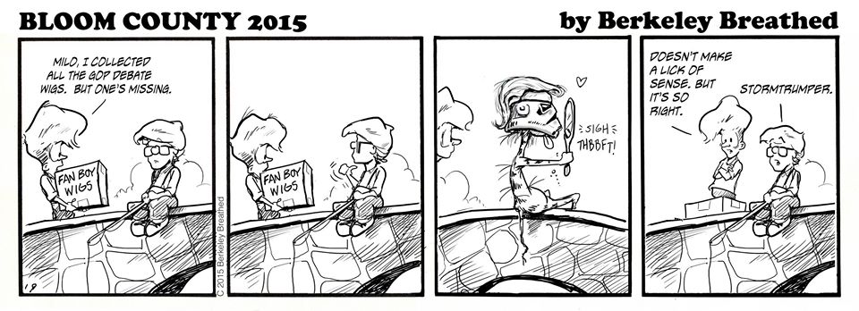 Donald Trump has brought joy to comics—though not to me—and even inspired Berkeley Breathed to start up his Bloom County comic once again after a thirty plus year absence. If, as most of my friends think, Trump will self-destruct long before November 2016, all well and good. But, if not, look for another Reichstag fire, concentration camps for Mexicans and women, and perhaps another land invasion of Russia.