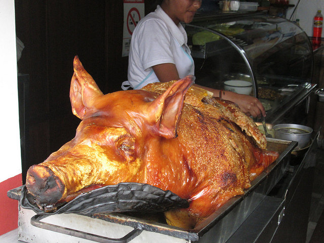 Dan and I were in Otavalo, two hours north of Quito. Famous for its textile and other handicrafts, the town of some 90,000 inhabitants is also famous for fiestas. In addition to the Ecuadoran equivalent of carnitas (shown above), there are other local meat specialties, such as cuy, or guinea pigs (shown below). In both Peru and Ecuador, I have seen paintings in cathedrals of the Last Supper in which Christ and his apostles were dining on cuy. (I’ll try to post one of them at some point in the future.)