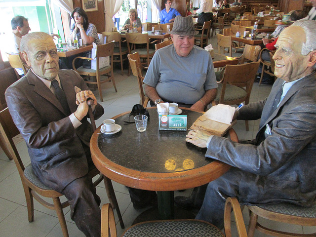 But my memories of this Ombú are all happy ones. I have eaten at the café there twice, both times having excellent meals. The first time was with Martine in 2011. In 2015, I met with my friend David Benesty there. Below is a picture of David sitting between Borges and Bioy-Casares at what was once their favorite table: