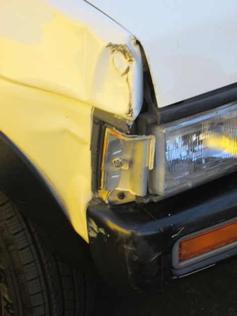 Damaged were to my front bumper, right headlight, a gash on the panel to the right of the engine, and my right rear-view mirror, which hangs on two thin wires.