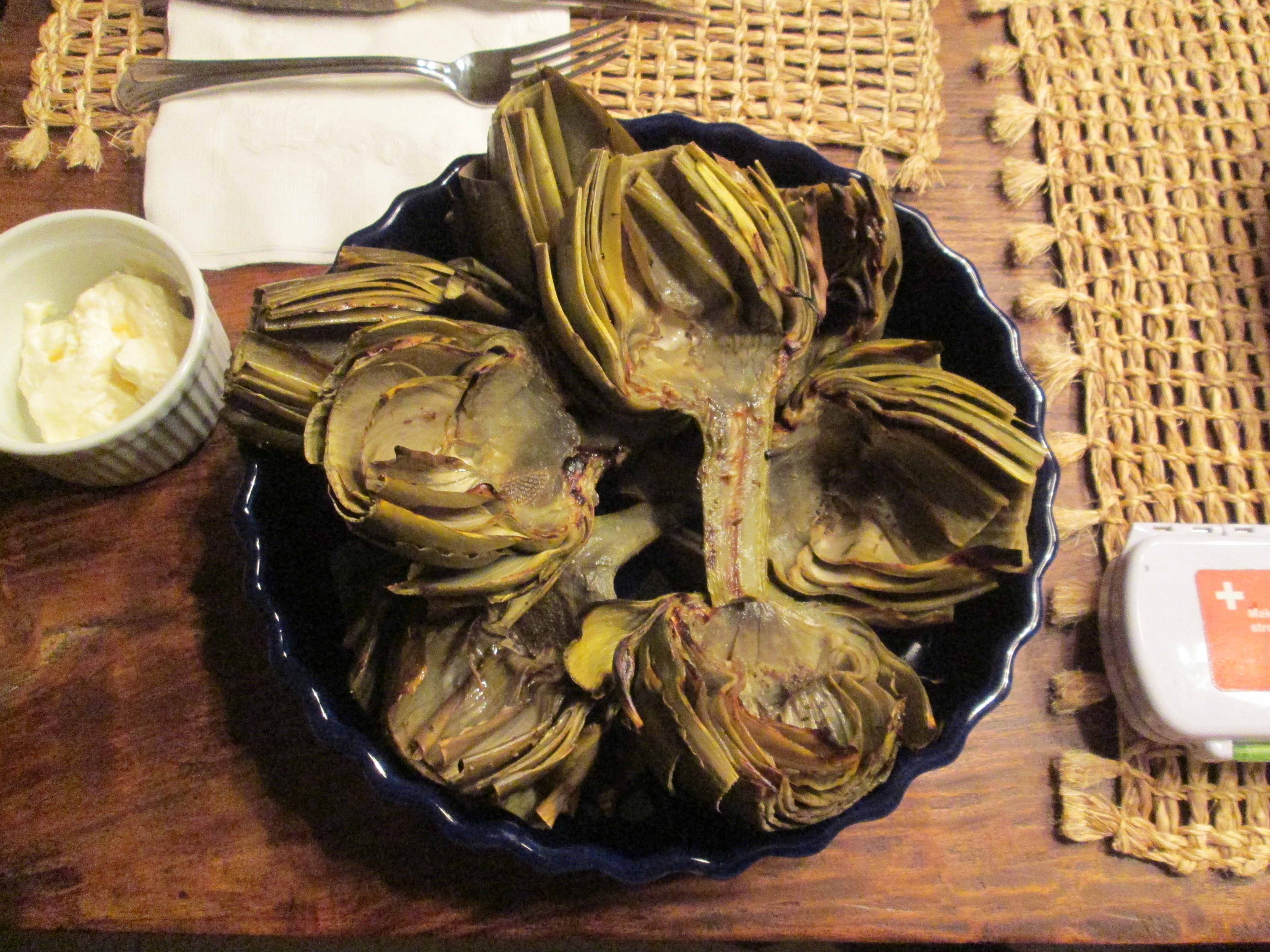 Last week at this time, I was in Palm Desert with my brother, my sister-in-law Lori, my niece Hilary and her family, and my niece Jennifer. We were looking in amazement at what Dan had prepared for us: a feast featuring various cuts of meat that would make any carnivore drool. There were also several varieties of roasted vegetables, such as the artichokes pictured below. To make it a truly gourmet experience, Dan had prepared a batch of homemade Béarnaise sauce which was so good that it seemed to go with everything.