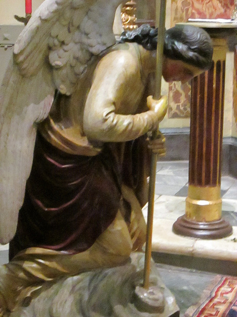 The angel in the above picture appears to be driving a spear into some unformed material, like clay. There is a look of determination on the angel’s face as well as a feeling of strength. Most of the statuary and art in the churches were actually done by Peruvians, and not transshipped from Europe.