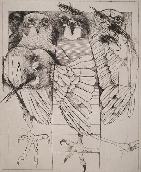Note the face seeming to emerge from the upper right behind the foreground figure, who appears to be paralyzed with fright. Much more traditional is the drawing of three hawks below.