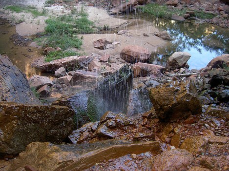 Illustrated above is another one of those falls, at Lower Emerald Pool. In the extreme heat of Zion, Martine and I rested on a boulder with the deep shade and stray drops of cool (and very old) water helping us keep comfortable. The ranger had also mentioned that the sandstone purified the water in the process, but Martine and I had cool water in our canteens. I always take the precaution of leaving our canteens in the freezer so that we can be refreshed later in the day during our hikes.