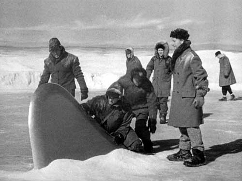 My favorite science fiction film of the 1950s was The Thing from Another World, an RKO cheapie that was superbly written and, for me as a boy who grew up in that strange era, utterly frightening. The whole film takes place in a research camp in the remote arctic north of Alaska. An army officer (Captain Hendry) receives orders to investigate the landing of an unknown object weighing some 20,000 tons (18 million kilograms)—far above the weight of known aircraft of the period. Also, it could not be a giant meteor because it went up before ultimately landing.