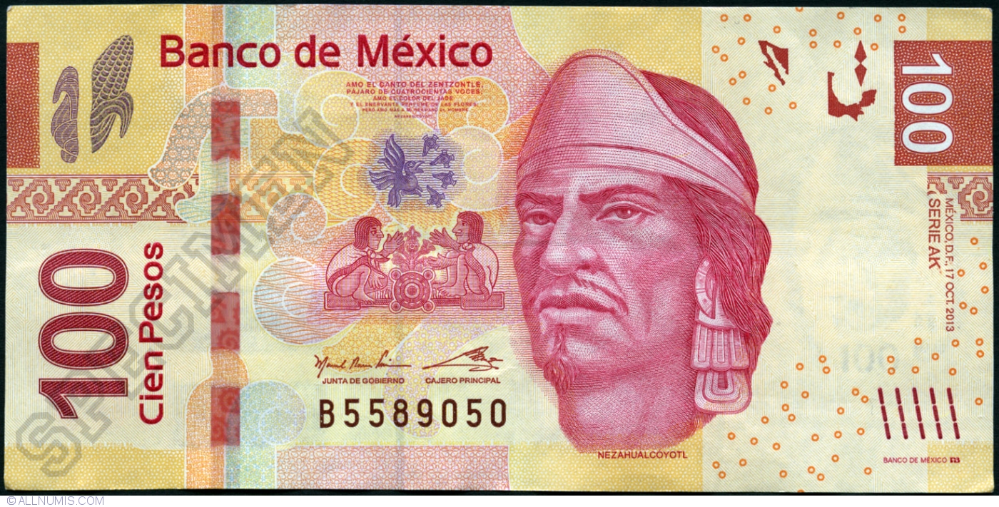 Above are the 200 and 100 Peso bank notes. I was intrigued by the figure shown on the 100 Peso note of Nezahualcoyotl, “Coyote Who Fasts,” who died some fifty years before Hernan Cortés landed at Vera Cruz with a party of conquistadores.