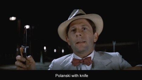 I have always loved film noir, a uniquely American genre that reveals the dark underbelly of life in the U.S. It gets particularly interesting when that revelation is from a foreign filmmaker who succeeds in seeing us for what we are. And, of course, although he is a great film artist, Polanski has been driven from our shores for statutory rape several years after his lovely pregnant wife, Sharon Tate, was mutilated and murdered by Charles Manson’s followers.