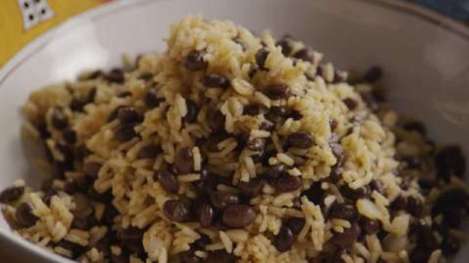 Then and only then, remove the cover and stir briefly. If all the liquid is absorbed, add some more and continue. Then open a can of black beans and pour the beans and the liquid it came with on top of the rice. Re-cover the pot and cook for another ten minutes or so, adding salt and pepper to taste. Before serving, garnish with parsley or cilantro.