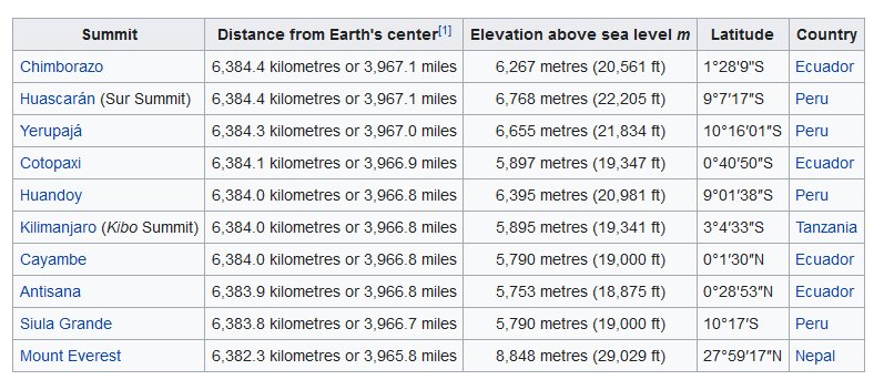 One upshot of this phenomenon is that some of the mountains nearer the Equator are actually higher than any of the Himalayas, including Mount Everest. The so-called Equatorial Bulge calls for a more accurate measure of a mountain’s altitude than distance above sea level—especially as the bulge means that sea level is correspondingly higher. A more accurate measure is distance from the center of the Earth.