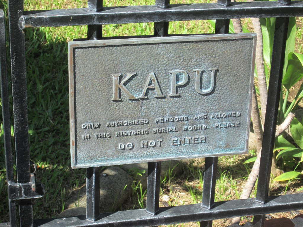 In the southeast corner of the grounds at Iolani Palace is a low mound that bears the Hawaiian language warning “Kapu.” Because the Hawaiian language doesn’t have the sounds of the consonants “t” and “b,” it would not make any sense if the sign red “Tabu.” Yet that is what it means.