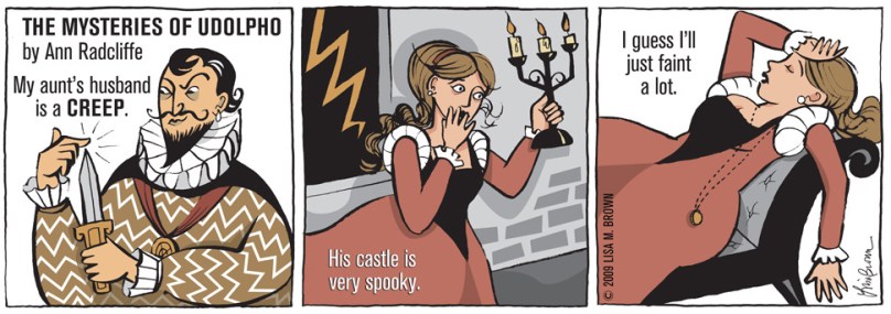 In many ways, the highly atmospheric castle with all its ruined galleries, secret passages, outlandish tapestries, and the cavorting banditti who make the castle their headquarters is the star of the novel. It is hard for a 21st century male such as myself to admire a frequently fainting heroine such as Mlle. Saint-Aubert. I managed to stick it out for the novel’s full 620 pages because Ann Radcliffe is really a superior writer. The things I didn’t like about it were more the result of the culture of the times than any deficit in the author’s abilities. There are some beautiful passages and not a few negligible verses.