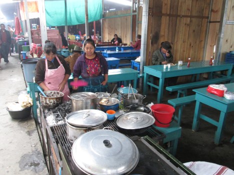 The above photo was taken at the market by the second class bus station of Antigua. Below is a scene from the Thursday market at Chichicastenango, where the women shown prepared a great breakfast of beans, eggs, fried plantains, and atole (a hot corn beverage) for just a few quetzales.