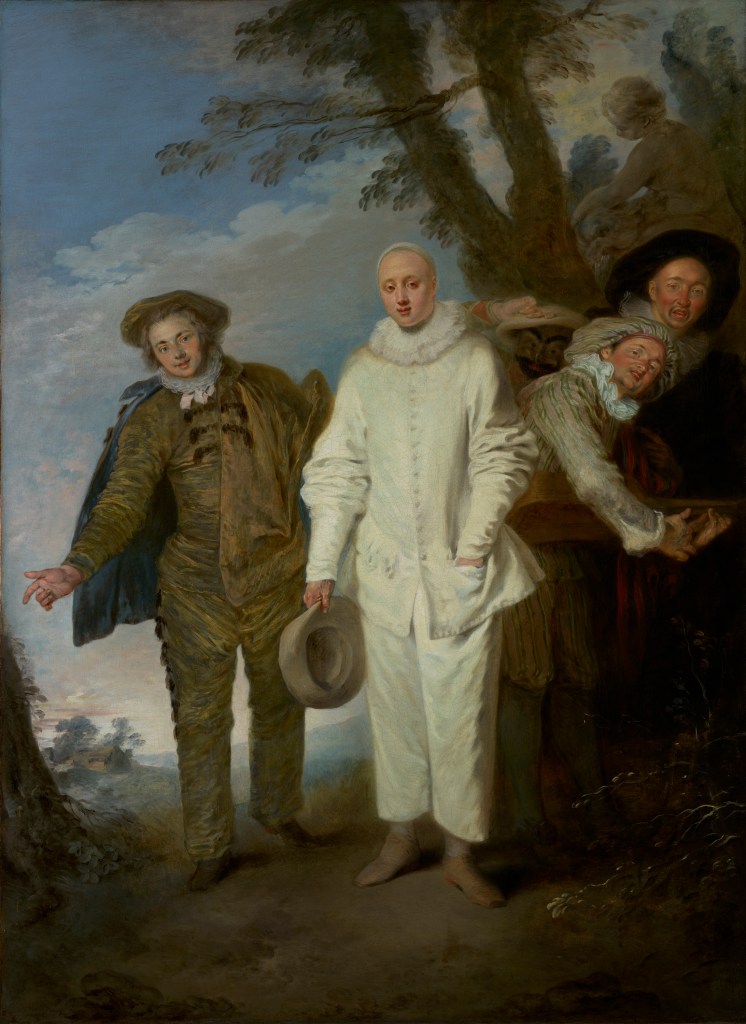 On one hand, there are theatrical characters from the Italian commedia dell’arte. To serve as contrast, they are usually outdoors in natural settings. According to he museum’s description: