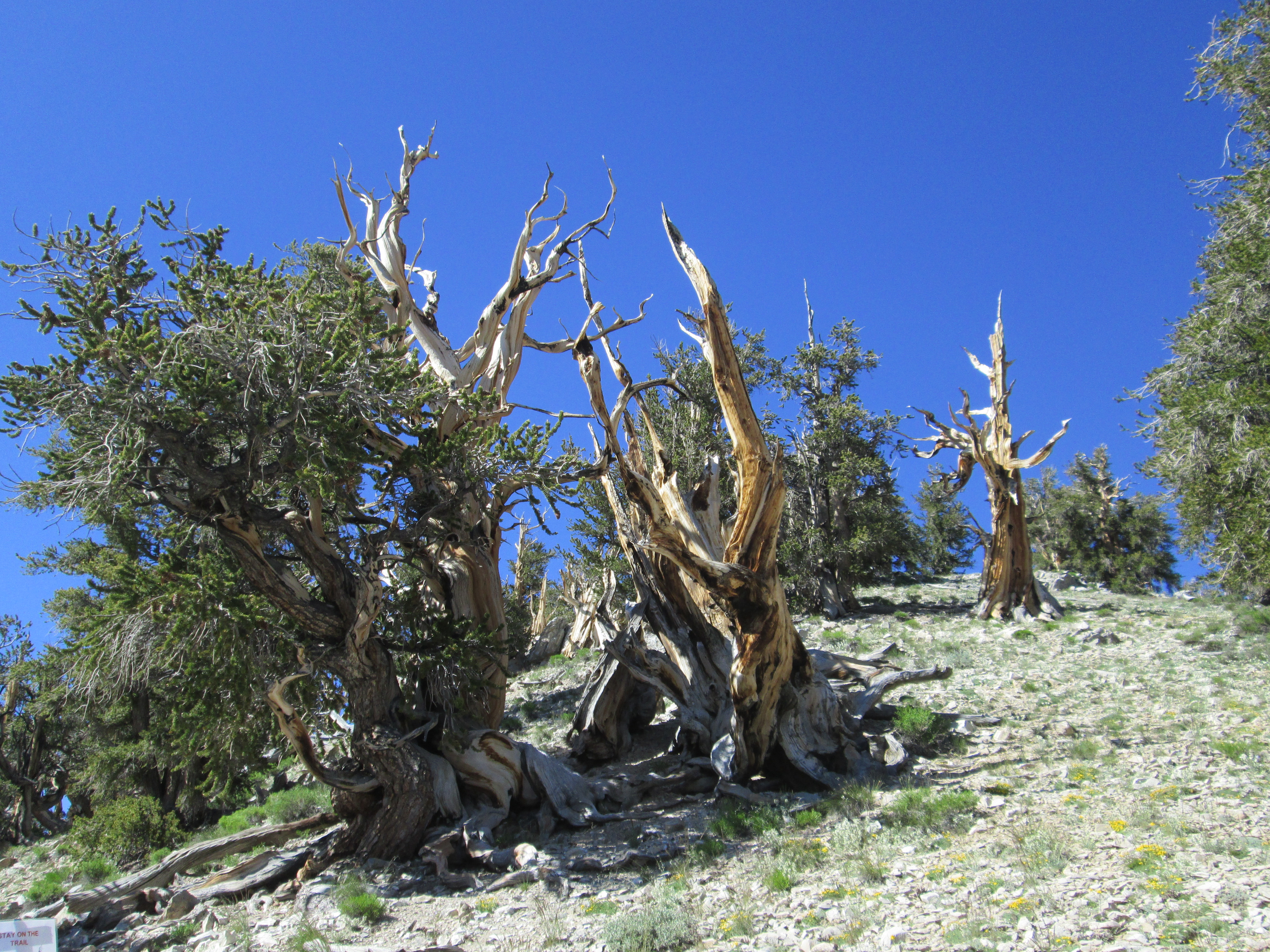 While there, we hiked along a trail (shown above) where there were numerous Great Basin Bristlecones (Pinus longaeva). Eventually, the altitude started to get to us; so we headed back down.
