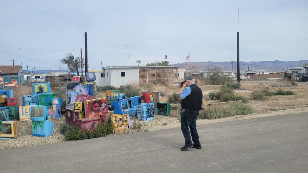 On the other hand, there is no cost to live in Slab City. In addition to about 150 year-round residents, during the winter months thousands of snowbirds from around the US. and Canada park their RVs in an empty spot along the road and prepare to enjoy a life of doing not much.