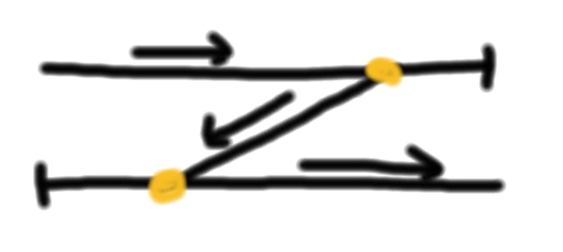 The train moves forward from the upper left to the end of track at the same level. Note the orange dots which represent switches. A rail employee throws the first switch, and the trains backs up past the second switch to the lower level end of track. Then the second switch is thrown, and the train moves forward at the lower level to its destination, the crafts village of Sibambe.