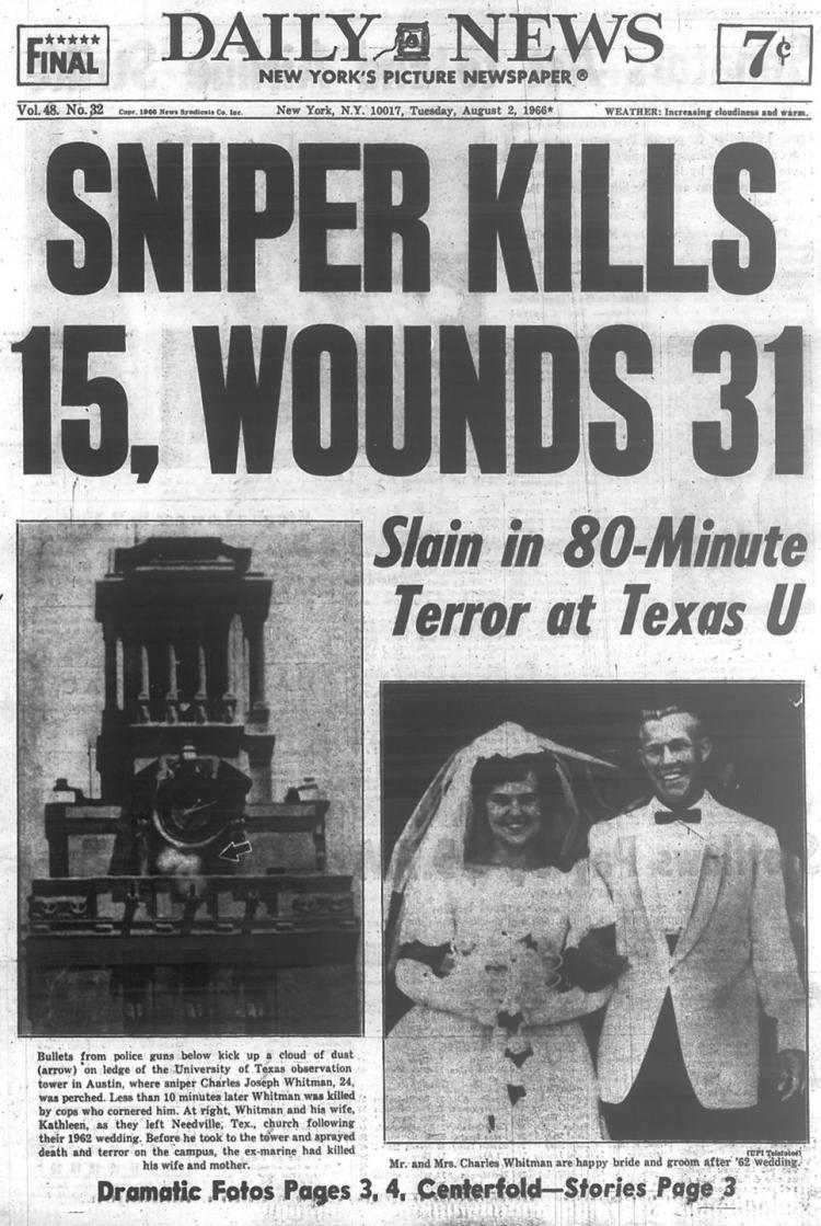 He was right. I read about the Austin, Texas shooting incident in the Cleveland Press and Plain Dealer. Never before had I or my family seen such a gratuitous act of violence toward the innocent. Charles Whitman first killed his mother and his wife, and then took guns to the tower on the University of Texas campus and opened fire at random people who were just going about their business. In an hour and a half, he killed thirteen people and wounded thirty-one. Too bad he didn’t have access to the hi-tech military weaponry that was used in the Las Vegas mélée by Stephen Paddock.