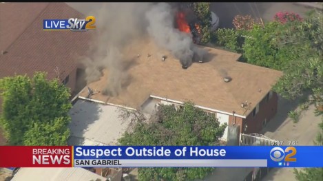 Today, there was a special event. An allegedly homeless man wearing an LA Dodgers hat and no shirt caused a ruckus in the 2000 Block of Brighton Avenue in San Gabriel. Around 1:30 in the afternoon, his girlfriend or acquaintance reported him to the police. The Sheriff’s Department showed up in force. When the man in question began firing at the police, the SWAT team was called in. But that was only the beginning. He set fire to two houses, continued shooting at the police, throwing lit firecrackers at them (?!), and running back and forth from house to car and boat and back again.