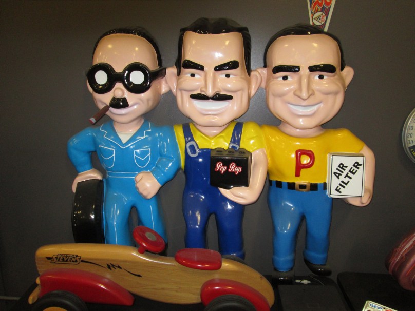 I was enthralled yesterday by this Pep Boys plastic logo at Oxnard’s Murphy Automotive Museum. I compare Manny, Moe, and Jack to the automobile repairman in Patrick Modiano’s novel Villa Triste: cool, detached, intellectual.