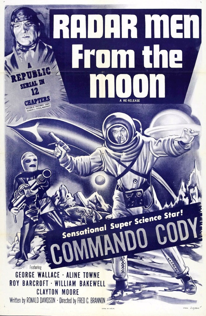 Thanks to the ’rona quarantine, I have been seeing a lot of movies on television and on my computer. Today, I tipped the scales toward schmaltz by viewing all twelve episodes of a 1952 Republic Studios serial entitled Radar Men from the Moon. It starred George Wallace as the hero, Commando Cody. (It appears that Commando is his first name, not his title, as he is addressed by characters several times as “Commando.”) For me, however, the most interesting character is Clayton Moore, who both before, during, and after the serial played the Lone Ranger on TV with Jay Silverheels as Tonto.